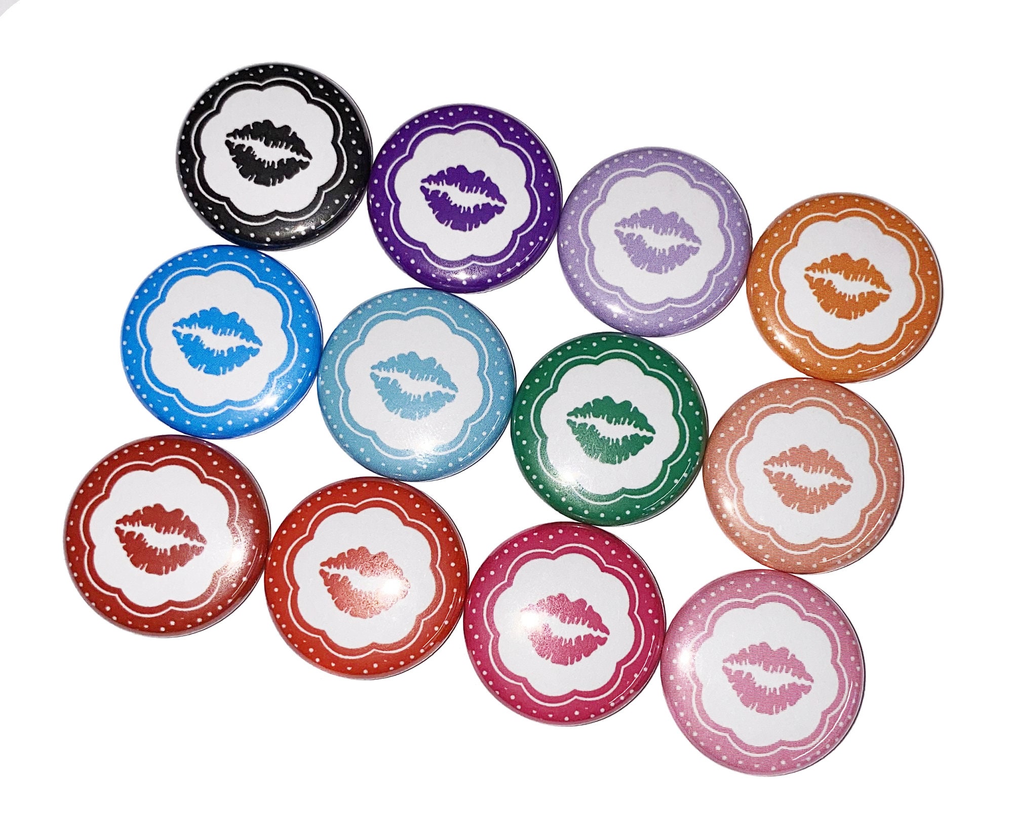 These buttons are available in 4 sizes: 1", 1.25", 1.5", and 2.25". You must select the button size you would like along with your quantity in the drop down box. Buttons have a magnet attached to the back. This listing is for a random assortment of buttons as pictured. If you would like to choose your own buttons out of this set, please send me a message to request a custom order.