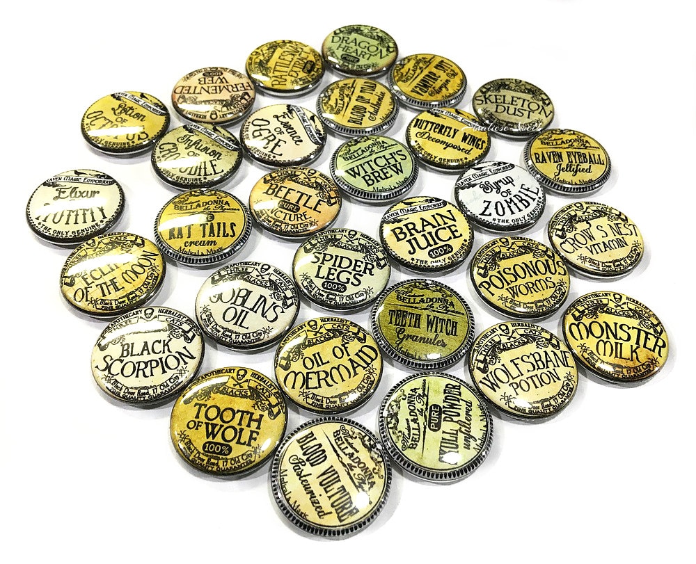 These buttons are available in 2 sizes: 1" and 1.25". You must select the button size you would like along with your quantity in the drop down box. Buttons have a magnet attached to the back. This listing is for a random assortment of buttons as pictured. If you would like to choose your own buttons out of this set, please send me a message to request a custom order.