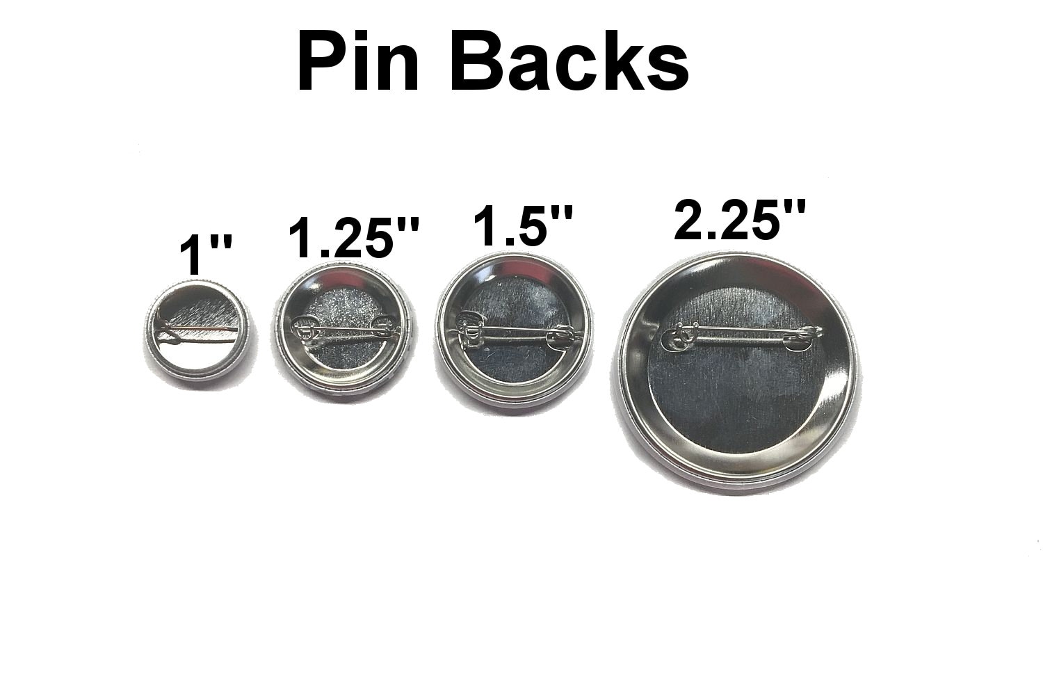 Metal flat backs and plastic flat backs are usually used for craft projects. These cannot be pinned to anything and are not magnets. Plastic flat backs are only available for 1" buttons.