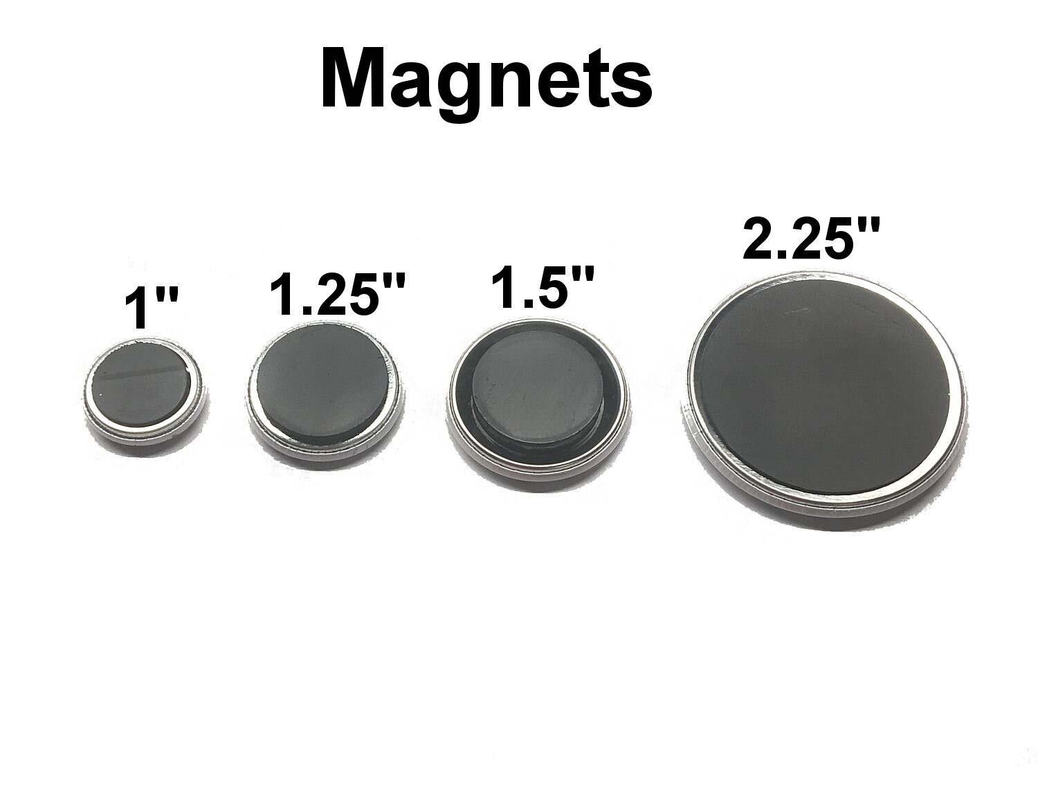 Metal flat backs and plastic flat backs are usually used for craft projects. These cannot be pinned to anything and are not magnets. Plastic flat backs are only available for 1" buttons.
